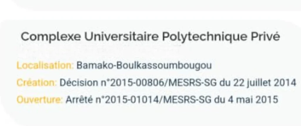 Le Complexe Universitaire Polytechnique Privé est reconnu par le Ministère de l’Enseignement Supérieur et de la Recherche Scientifique (MESRS) par la décision n°2015-00806/MESRS-SG du 22 juillet 2014, comme établissement d’enseignement Supérieur au Mali.